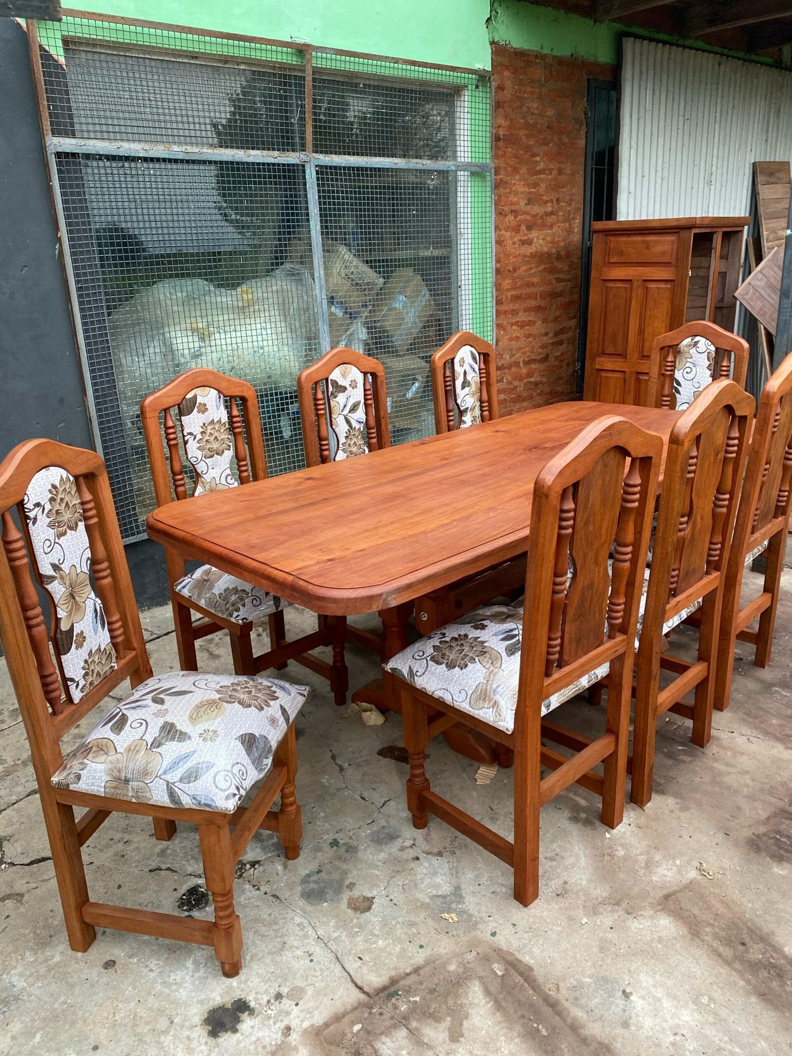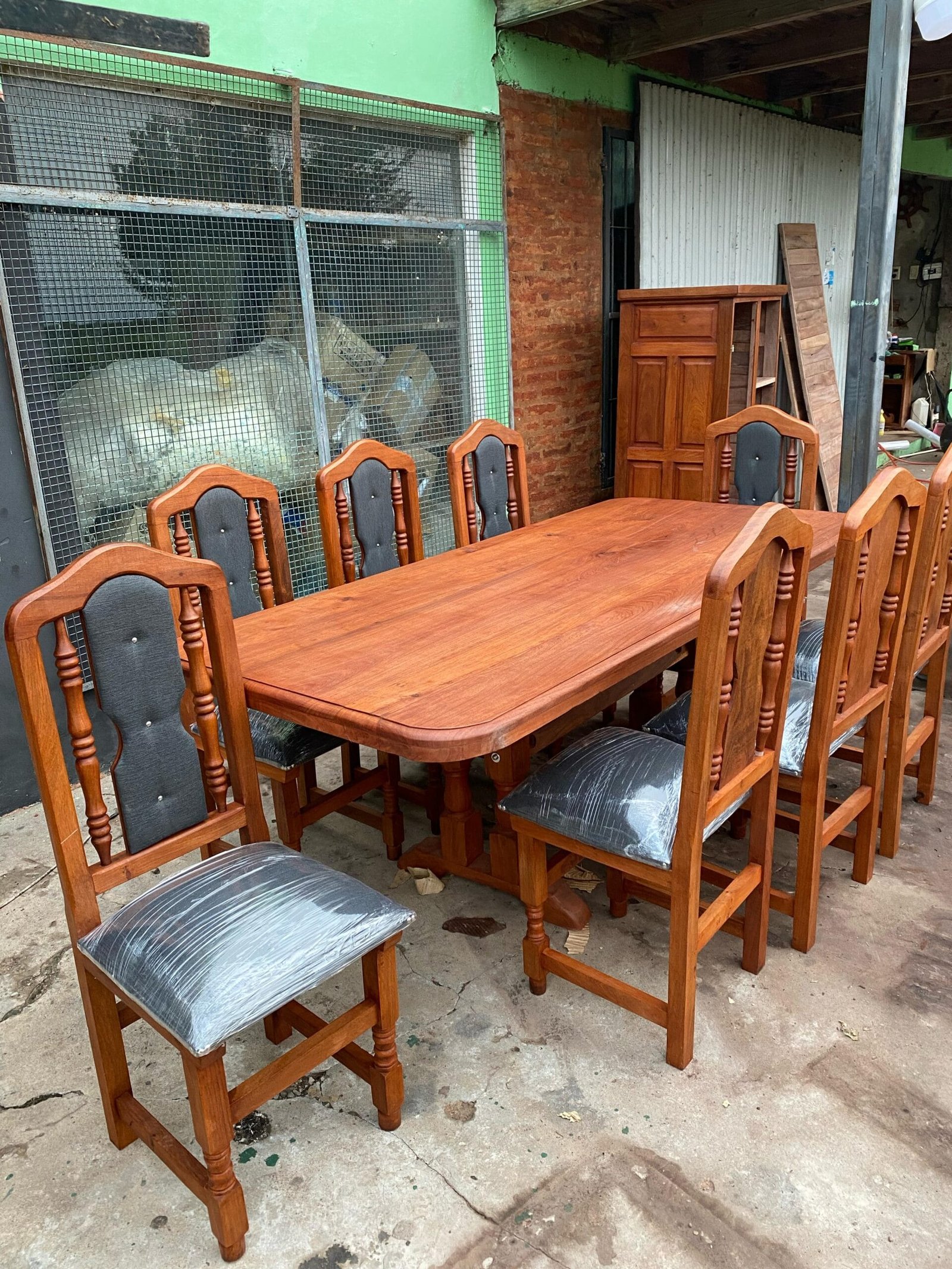 Nuestra mesa de algarrobo macizo de 2 metros ofrece espacio ideal para reuniones familiares o cenas especiales, acompañada por 8 sillas tapizadas que combinan diseño clásico y comodidad.