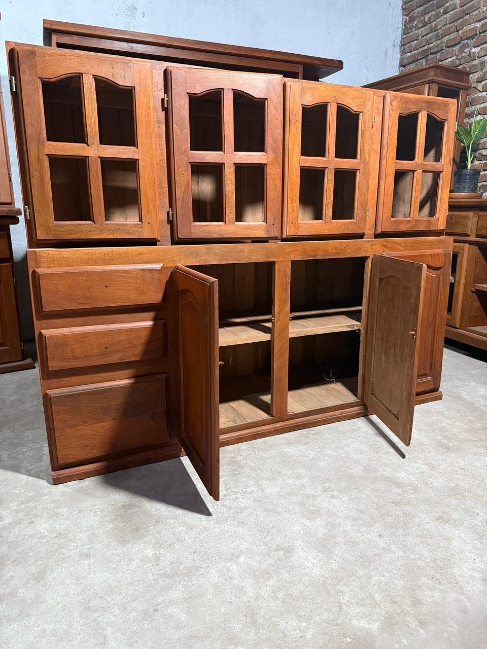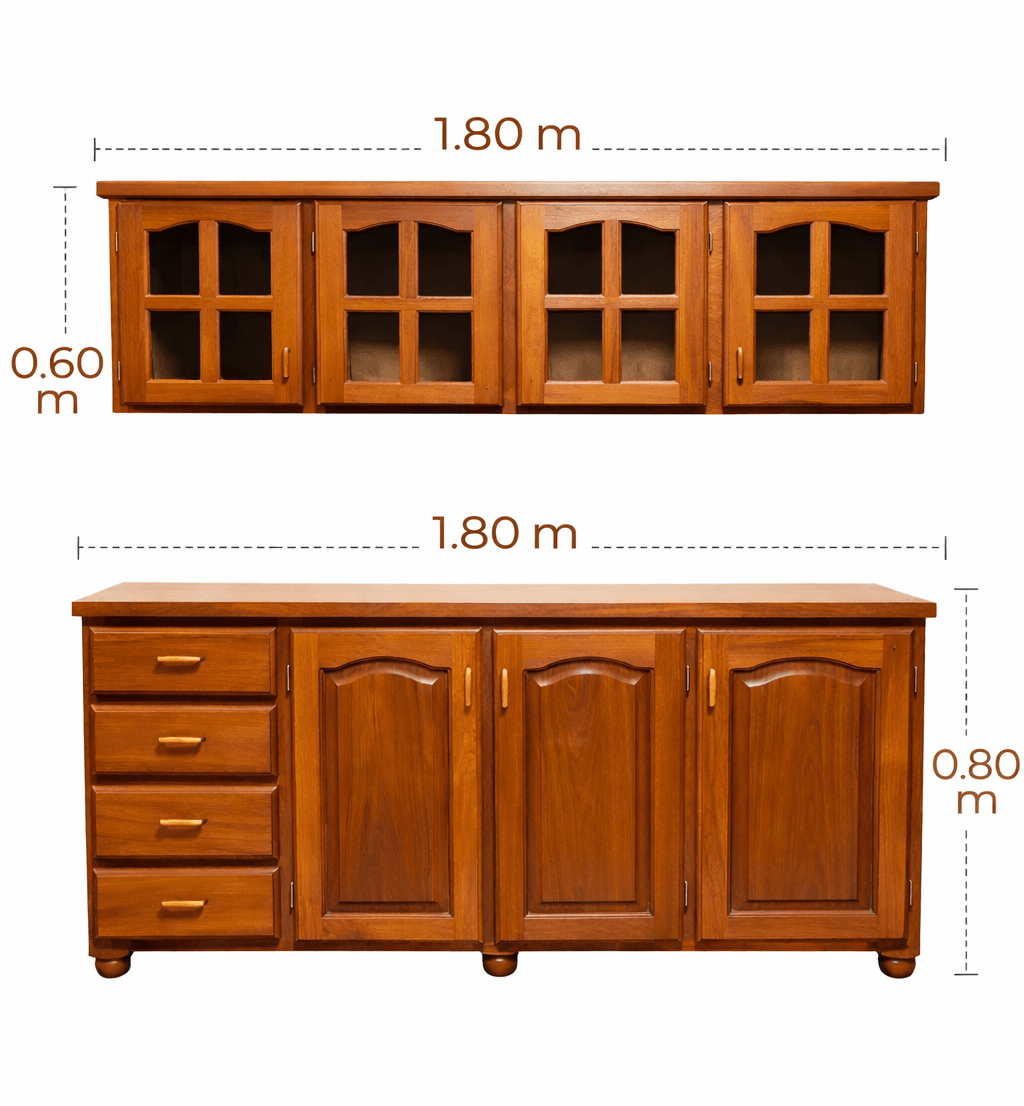 El bajo mesada cuenta con cajones laterales y puertas con amplio espacio interior, mientras que la alacena superior posee puertas vidriadas, ideal para guardar y exhibir vajilla.