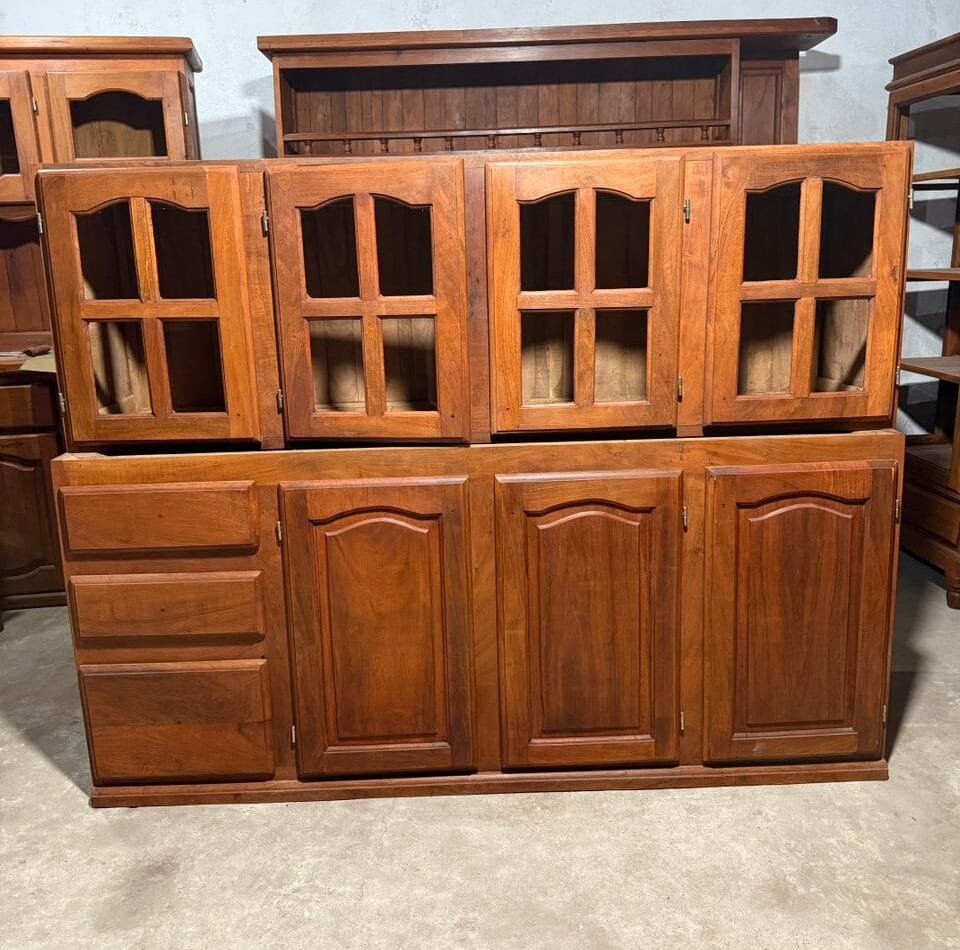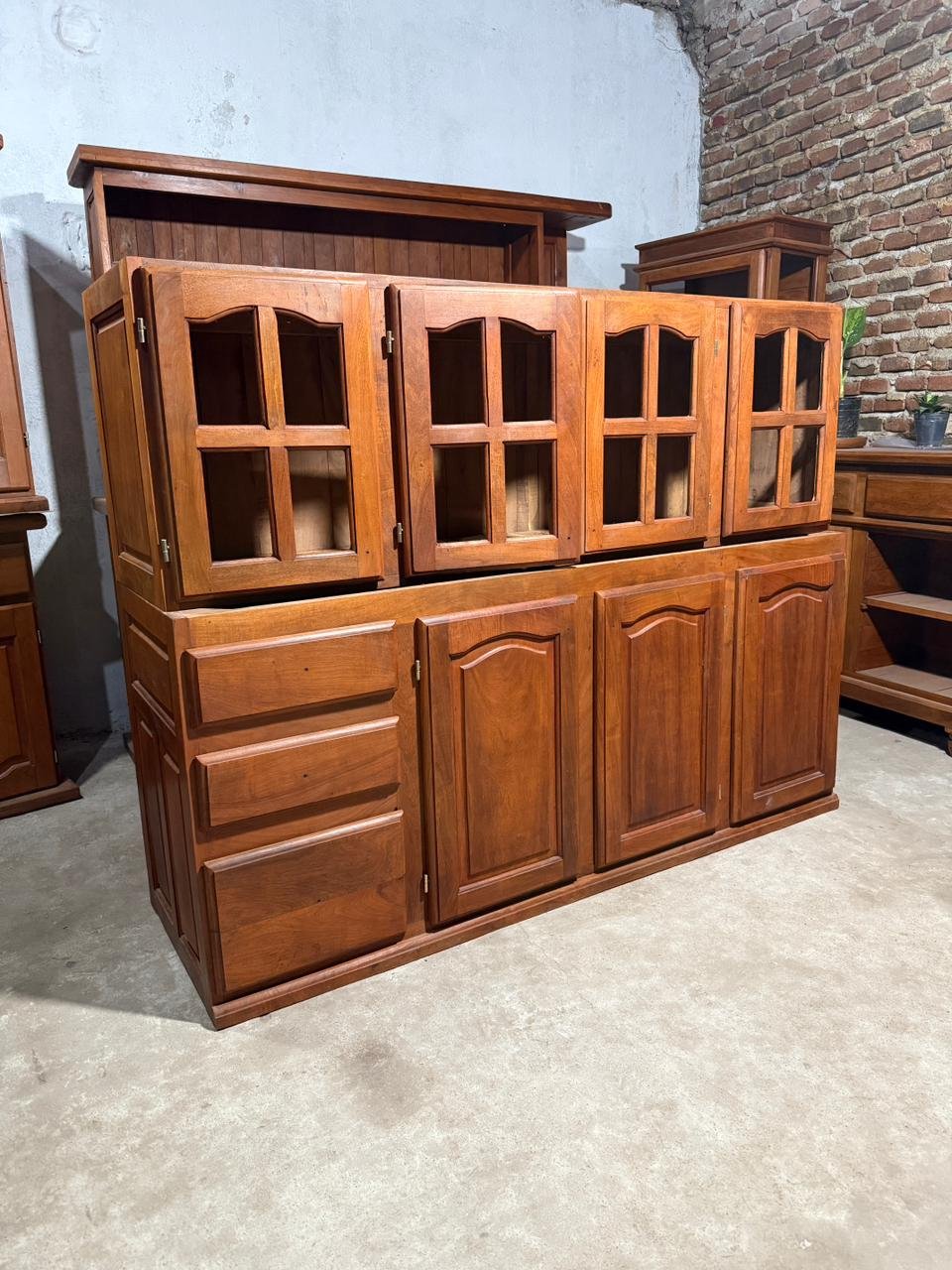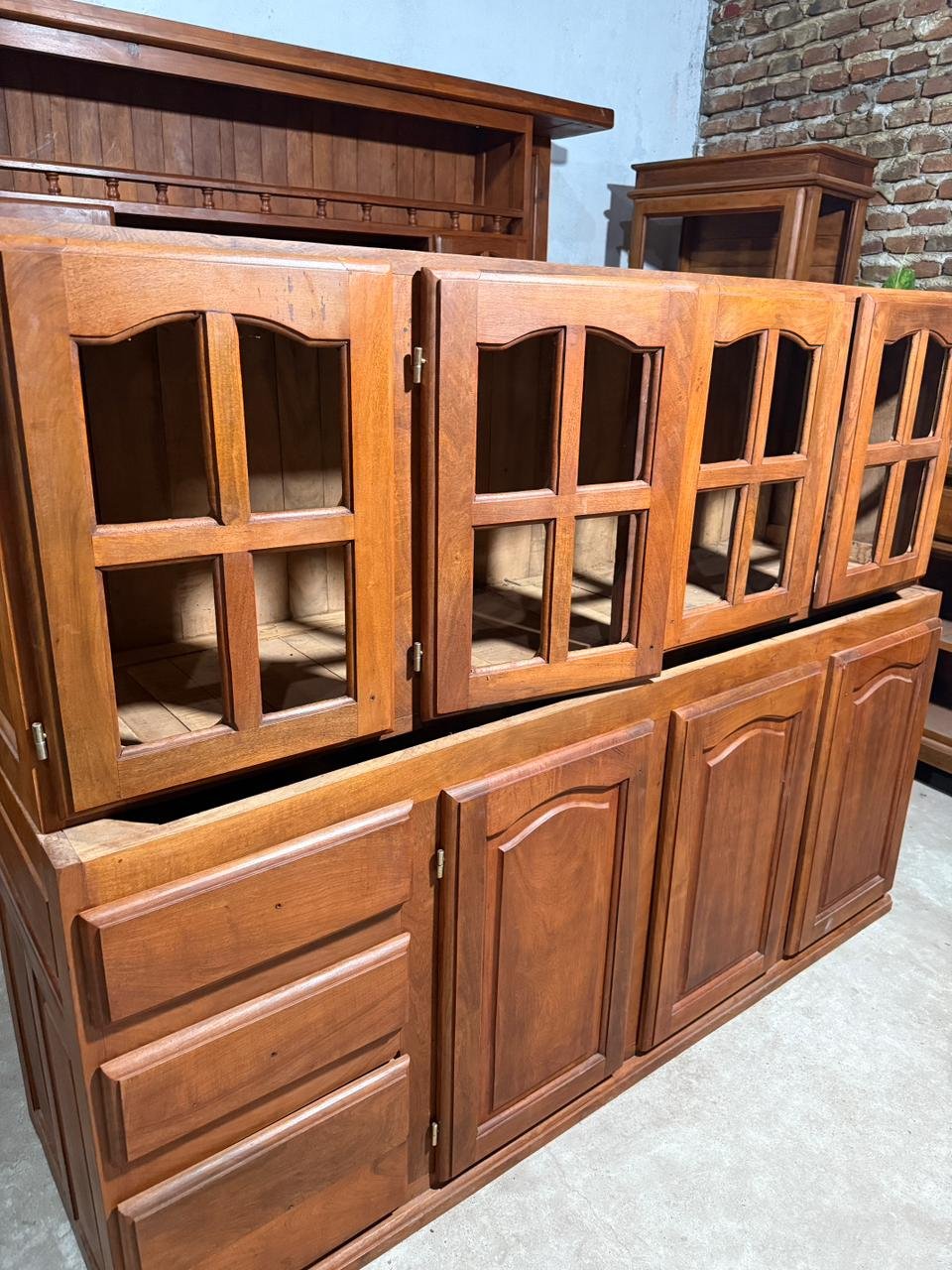 El mueble incluye sus respectivos tiradores (manijas) y está trabajado con terminaciones en algarrobo macizo, lo que garantiza gran resistencia, peso y larga vida útil.