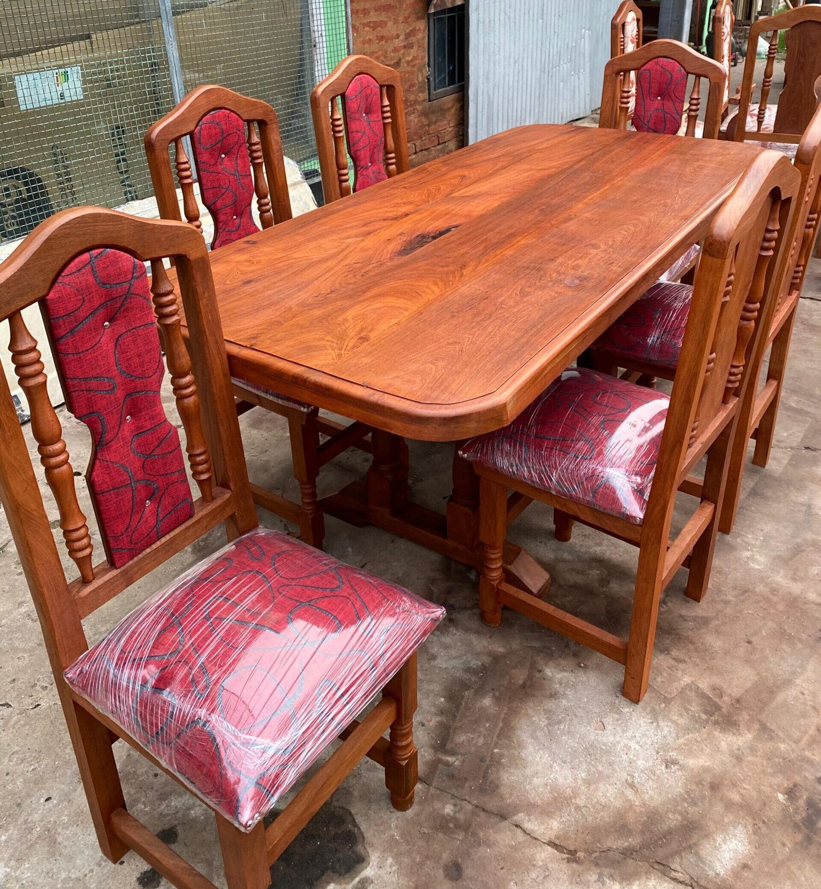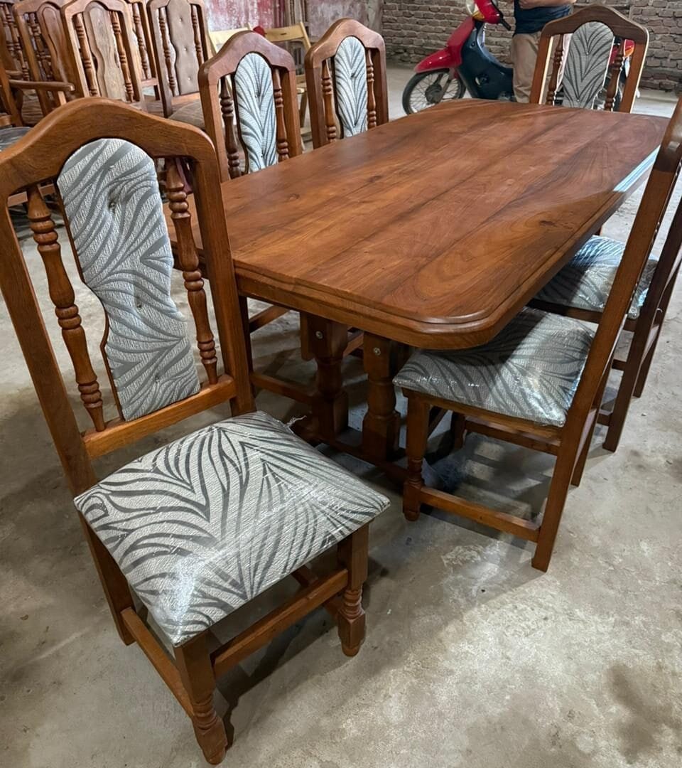 La mesa de 1.80 m de largo por 0.80 m de ancho brinda un amplio espacio para compartir comidas en familia o con amigos, mientras que las sillas tapizadas suman confort sin perder la solidez que caracteriza al algarrobo.