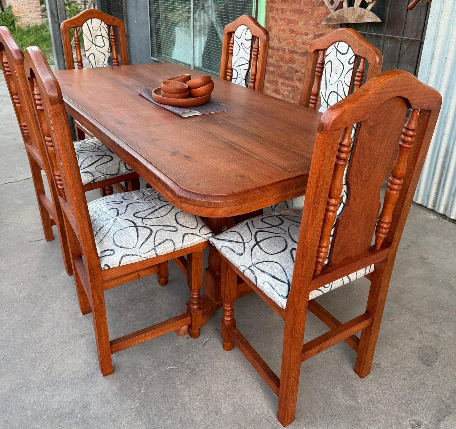 Elegancia, calidez y resistencia se combinan en este juego de comedor fabricado 100% en madera maciza de algarrobo. Su terminación en cera realza las vetas naturales de la madera y ofrece una protección duradera, aportando un acabado suave al tacto y de fácil mantenimiento.